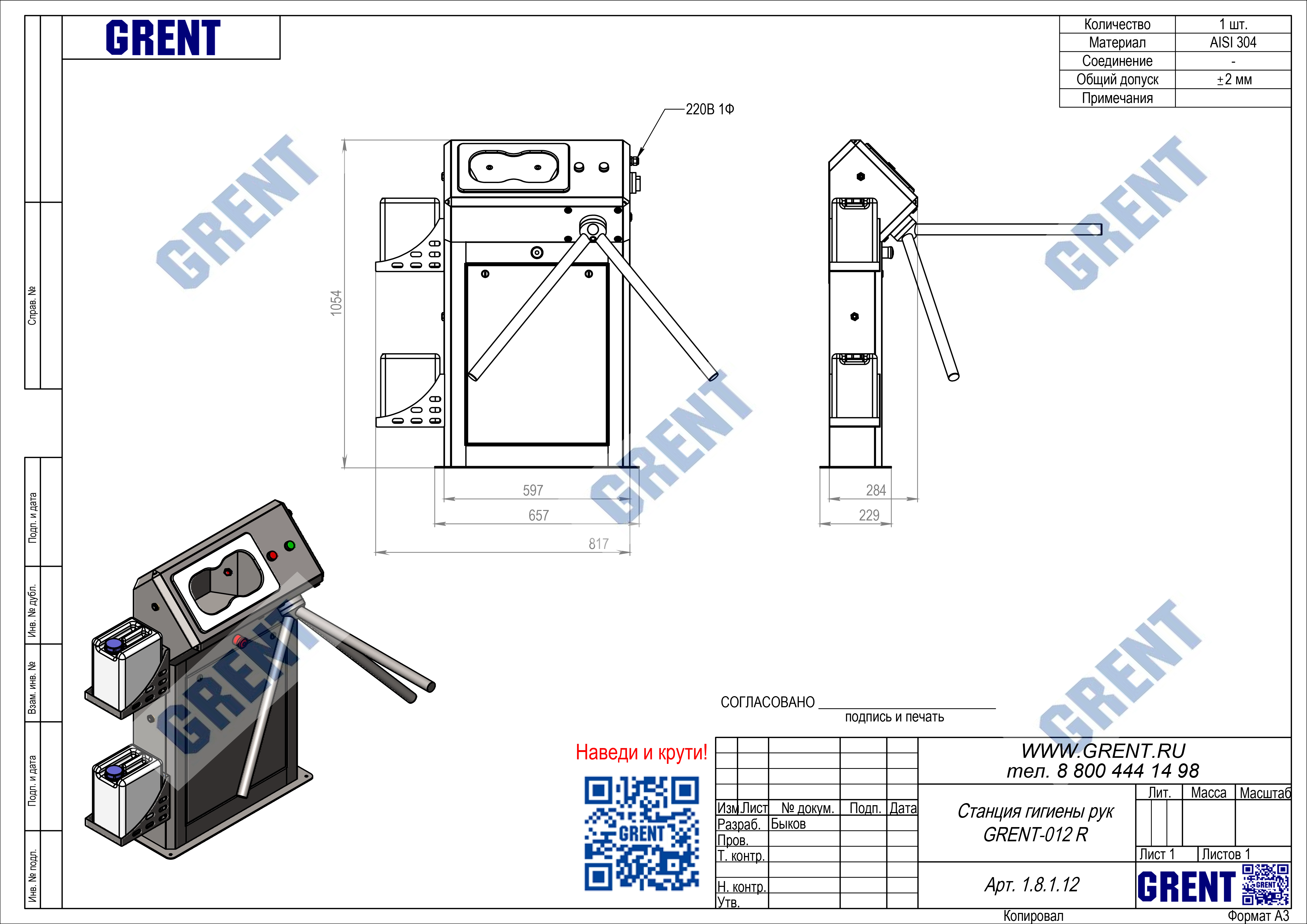 Станция гигиены рук GRENT 012 R предназначена для автоматической бесконтактной дезинфекции кистей рук персонала перед входом в чистую зону. Включение подачи дезинфицирующего средства происходит при поднесении обеих рук в зону срабатывания фотоэлементов, расположенных в дезинфицирующей камере. Дезинфицирующее средство подается автоматически при помощи электронасоса. Распыление дезсредства осуществляют 4 форсунки, расположенные в верхней и нижней части дезинфицирующей камеры, что обеспечивает обработку рук с двух сторон