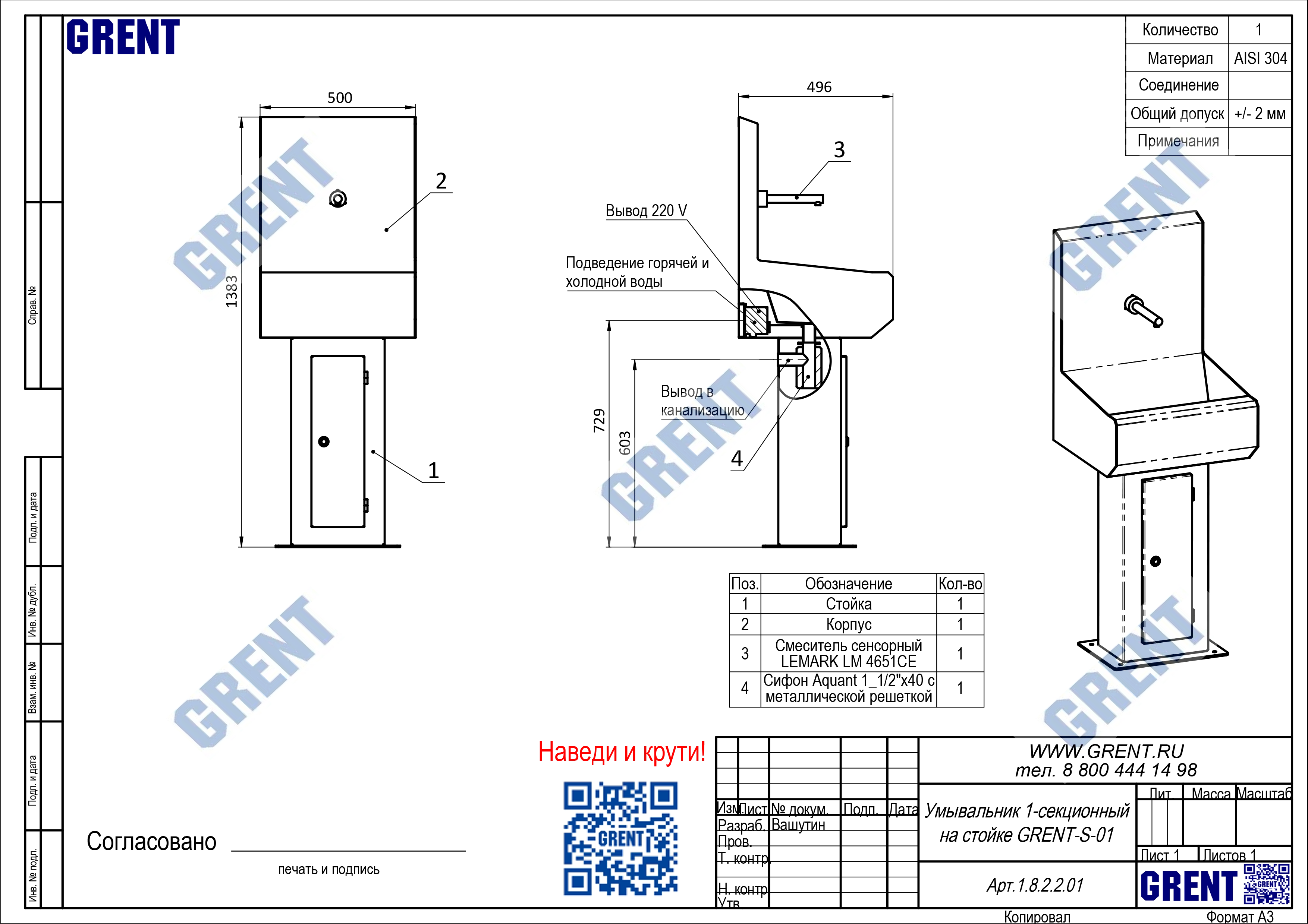 Одно секционный умывальник GRENT-S-01 используется для бесконтактной мойки рук персонала преимущественно на предприятиях общепита и пищевой промышленности. Активация подачи воды осуществляться фотодатчиком при поднесении рук к смесителю.