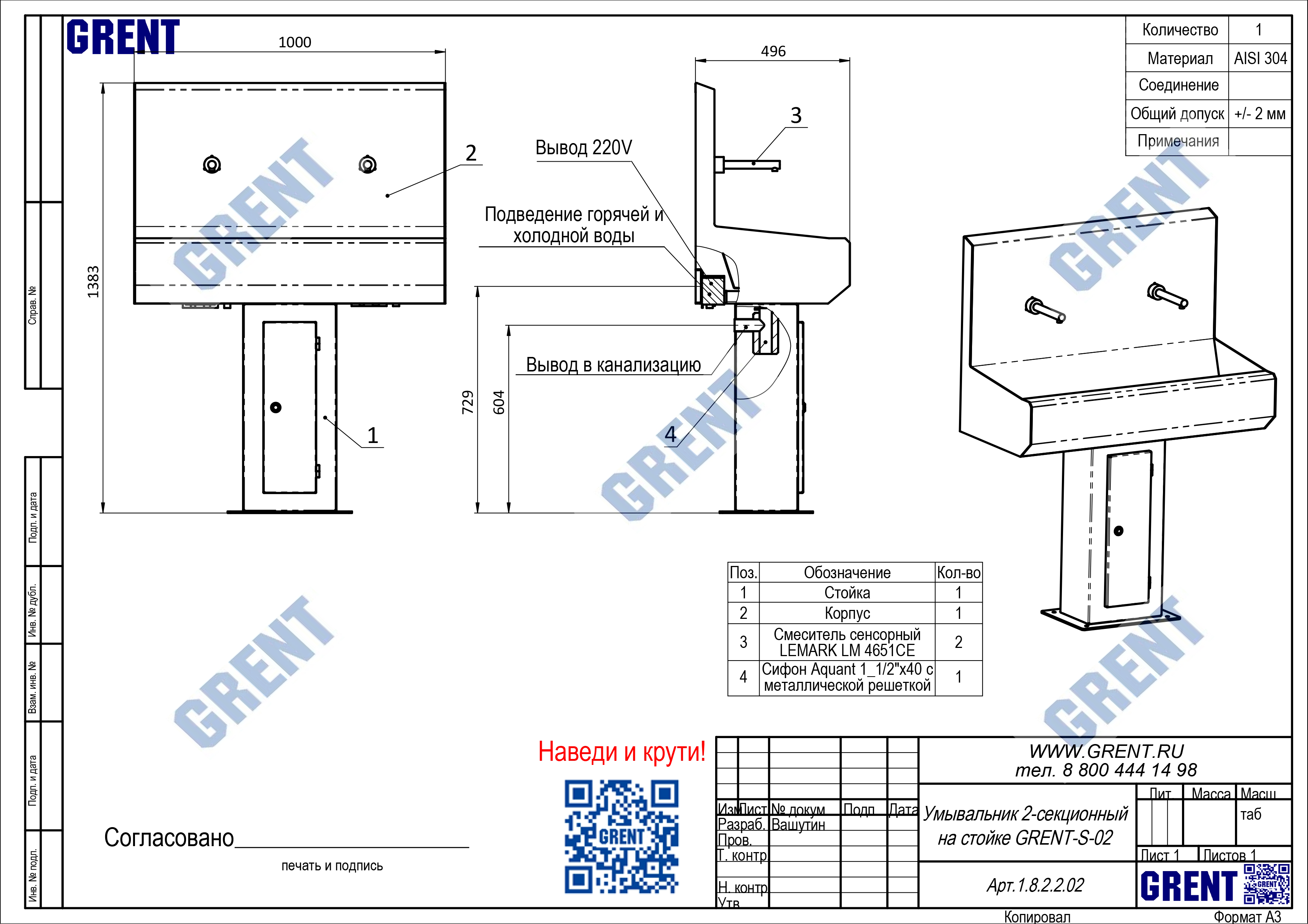 Двух секционный умывальник GRENT-S-02 используется для бесконтактной мойки рук персонала преимущественно на предприятиях общепита и пищевой промышленности. Активация подачи воды осуществляться фотодатчиком при поднесении рук к смесителю.